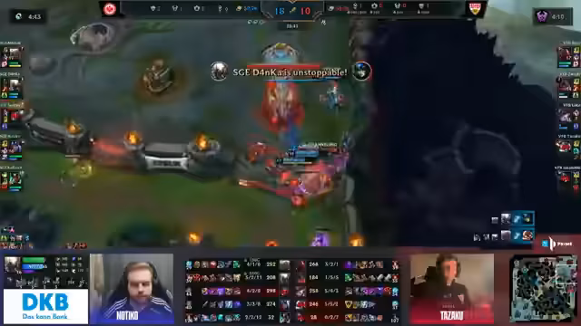 04:07:58Die Partie dreht sich endgültig, als SGE mit Orianna von Sencox eine immense Rohpower aufbaut. Senkoxs Shockwave wird zu einer unaufhaltsamen Waffe, die VfB AD-Carry Tazaku dezimiert. Frankfurt nutzt diesen Schaden, um den Baron zu kontrollieren und das Gold weiter auszubauen. VfB verliert die Kontrolle über das Spiel, da es keine Antwort auf die massive Frontline und den hohen Schaden der Orianna findet.
