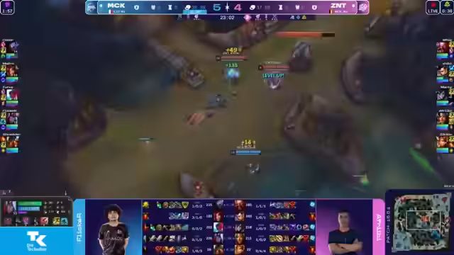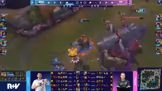 01:57:30Das Spiel erreicht seinen Höhepunkt mit einem Fight um den Baron-Nashor. BIG initiiert den Baron, aber Team Phantasma reagiert sofort. In einem chaotischen Kampf sterben mehrere Spieler von BIG, doch Dior kann den Barrel von Gangplank nutzen, um Team Phantasma zurückzudrängen und den Baron für sich zu sichern. Der Fight ist extrem eng und entscheidend, da BIG eine klare Chance hat, das Spiel zu gewinnen, die jedoch durch den Verlust mehrerer Schlüsselspieler verloren geht.
