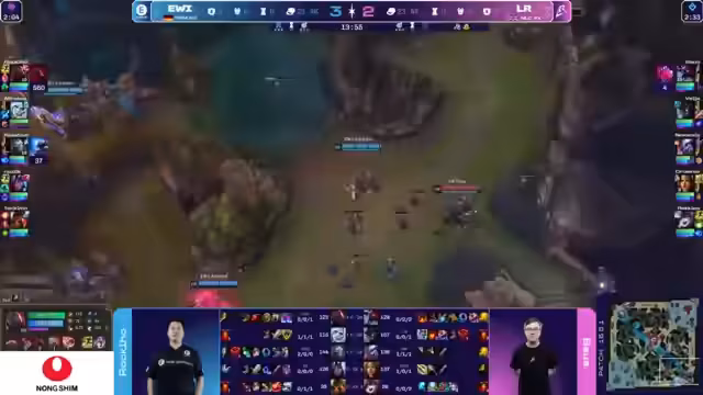 03:40:01Das zweite Spiel beginnt mit einer spannenden Dynamik. EWI startet stark und erzielt durch gut koordinierte Roams und Catch-Möglichkeiten einen frühen Kill an Afroboy. Das Kommentatorteam ist begeistert von der aggressiven Spielweise und dem guten Teamwork von EWI. Das Spiel verläuft zunächst zu Gunsten von EWI, das den Goldvorteil hält und Druck auf alle Lanes ausübt.