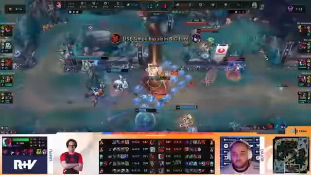 01:16:23Simpli kommt hinzu, um Limit und Bean zu catchen. Ein gezielter Knock-up von Simpli trifft Limit, jedoch nutzt dieser seine E, um dem Schaden zu entgehen. Bean flankiert und Dio teleportiert für den Backline-Engage. Ein scheinbarer Reset-Versuch scheitert, da Dio gestunnt wird und umkommt. Im Trade stirben Simpli und Dio, was einen 1-zu-1-Austausch zwischen Support und Midlaner bedeutet. Das Spiel bleibt auf Augenhöhe.