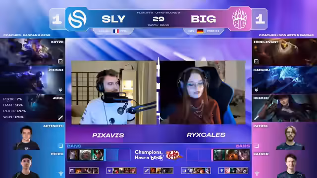 04:02:18Das aktuelle Match zwischen Solari und Big'em ist für die Upper Bracket Position von Bedeutung, da das parallel stattfindende Spiel zwischen Gliens und Movistakoi Phoenix ebenfalls 1-1 steht. Dies beeinflusst den weiteren Turnierverlauf und die Startzeiten der kommenden Spiele. Die Draft-Phase beginnt mit einem ungewöhnlichen Pike-Pick auf der Top-Lane, gefolgt von einem Kaiser-Bard als First-Pick, der zuvor zwei Games in Folge gebannt wurde. Am anderen Seiten wird die Yonara mitgenommen, während Solari auf Ryze setzt, was eine sehr starke und ungewöhnliche Rotation darstellt.
