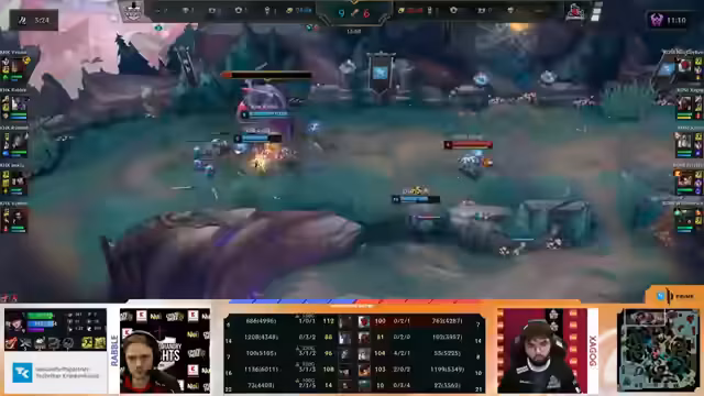 02:03:51Nach einem komplizierten Fight, bei dem beide Teams hohe Verluste hinnehmen, flippen die Hangry Knights den Baron Nashor. Dies kostet ihnen jedoch auch einen wichtigen Carrier, was Rossmann die Möglichkeit eröffnet, ein langfristiges Spiel zu machen. Die Centaure, nun wieder vorne, positionieren sich strategisch, um das Spiel systematisch zu ihren Gunsten zu entscheiden und setzen auf Druck statt auf einen riskanten 50-50-Engage.