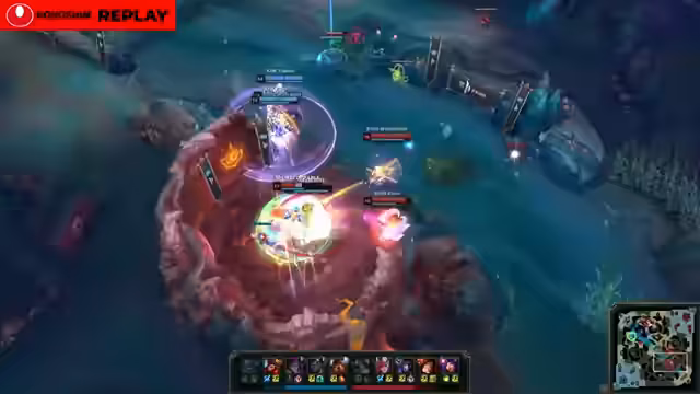03:59:03Nach mehreren vorausgegangenen Teamfents stehen sich die Teams an einem potenziellen Nashor gegenüber. Rossmann mit Sizz Effect als gefährlicher Träger entscheidet sich gegen den sicheren Baron-Buff und stattdessen für einen direkten Teamfight. Dies ist ein hochriskantes Play, das auf die Möglichkeit eines schnellen Finishes mit der ultimativen Ability des Kog'Maw setzt. Die Entscheidung liegt auf der Kippe und könnte die Serie entscheiden.