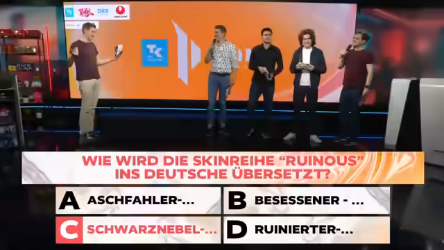 03:10:27Aus dem laufenden Spiel wird ein interaktives Segment 'Prime League Abitur' gestartet. Die Caster und Gäste beantworten Fragen zu League of Legends auf Deutsch, die den Zuschauern als Quiz präsentiert werden. Themen sind Champion-Fähigkeiten, Begriffe und Übersetzungen. Noten von 1 bis 4 vergeben, wobei Peko einen Fehler macht und eine Zwei erhält, während die anderen durchgehen. Das Segment dient der Unterhaltung und der Interaktion mit der Community.