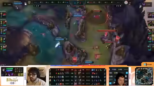 01:55:31Nach dem turbulenten Early-Game kontrolliert CJN das Spiel jetzt. Agurin ist als N jungle omnipräsent und seine Itemisierung beginnt ihn zum dominanten Faktor zu machen. Spandau kann kaum Druck auf die CJN-Laner aufbauen, und Pride, auf einem starken Top-Laner, findet sich in einem schwierigen Matchup gegen Nautilus wieder. Der Goldvorsatz wächst langsam aber stetig, und Analysten sehen CJN klar auf dem Weg zu einem zweiten Sieg, da ihr draft auf Teamfights ausgelegt ist und Spandaus individuelle Schwächen ausnutzt.