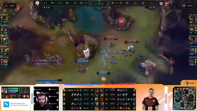 02:41:42Die ersten Minuten des Spiels EWI gegen Kaufland werden gezeigt. Es kommt zu einem frühen Skirmish, in dem Kaufland den ersten Kill holt und Vorteile auf der Bot-Lane sichert. Der Kommentator hebt hervor, dass dies untypisch für EWI ist, die sonst aggressiv spielen. Es entsteht eine Misskommunikation im Team, die zu Nachteilen führt. Die Analyse zeigt, dass das Spiel davon abhängt, wie Kaufland seinen Vorteil ausbaut und ob EWI zurückkommen kann.
