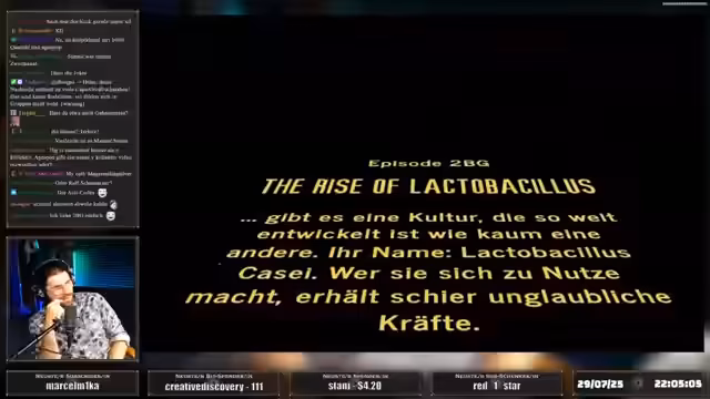 01:45:04Nach der Besprechung der Bundesländer wechselt der Stream zu exklusivem Content. Demnach wird das Video vom 'Sternenklang Festival 2025' im Voraus gezeigt, was für treue Follower eine Premiere darstellt. Danach wird ein humorvoller, kritischer Beitrag über das Joghurtgetränk Actimel gestartet. Es wird die Geschichte des Unternehmens Danone beleuchtet, von seinen Anfängen bis zu seinem heutigen Status als Milliardengeschäft. Die Kritik bezieht sich auf umweltschädigende Praktiken, aggressive Marketingstrategien und die Nutzung von dubiosen Zusatzstoffen.