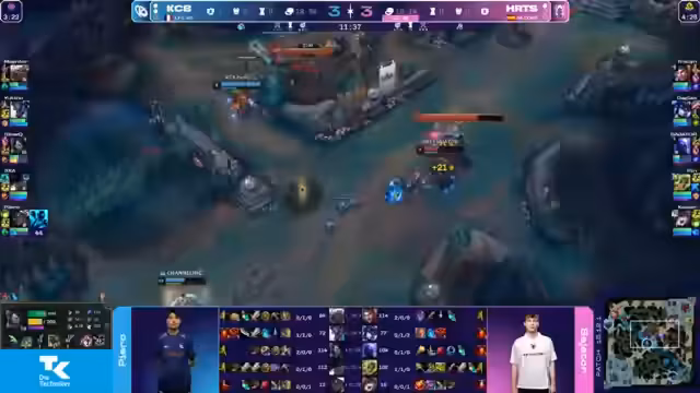 01:59:21Es kommt zum ersten großen Teamfight am Drachen, der in der Zeit spawnt. Casey Blue initiiert den Fight mit einem guten Engage von Piero und Kaiser. Der Fight ist extrem knapp und endet nach einem Double-Kill für Casey Blue ohne Tote auf beiden Seiten. Heretics bleibt aber durch Douglas' gutes Clears und map-Wide Presence leicht vorne. analysten bewerten den Fight als Casey Blue Performance, aber Douglas stabilisiert das Spiel für Heretics.