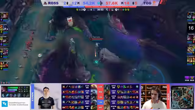 02:16:31TOG setzt auf einen Baron Nashor, während Rossmann dies als 'Hail Mary Play' nutzt, um den Slipfish zu unterbinden. Nach einem intensiven Fight, bei dem Rossmann einen Member verliert, nehmen sie den Baron Nashor. Sie pressen sofort weiter, holen dabei Xargok und Kaninen, nur um Tog in einen finalen Fight zu locken. Der erfolgreiche Nashor und der daraus resultierende Druck führen zu TOGs Sieg und dem Best-of-Five.