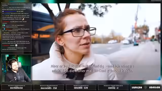 00:41:23Um der Armut in New York auf den Grund zu gehen, trifft sich der Streamer in der Bronx mit Miranda, einer jungen Mutter, die mit ihrem Sohn in einer Notunterkunft lebt. Sie berichtet davon, dass sie sich aufgrund ihrer geringen Einkünfte als Putzkraft keine eigene Wohnung leisten kann. Bei einem gemeinsamen Einkauf für die Familie, die staatliche Lebensmittelhilfe erhält, verdeutlichen die hohen Preise die finanzielle Notwendigkeit der Hilfe und die täglichen Herausforderungen.