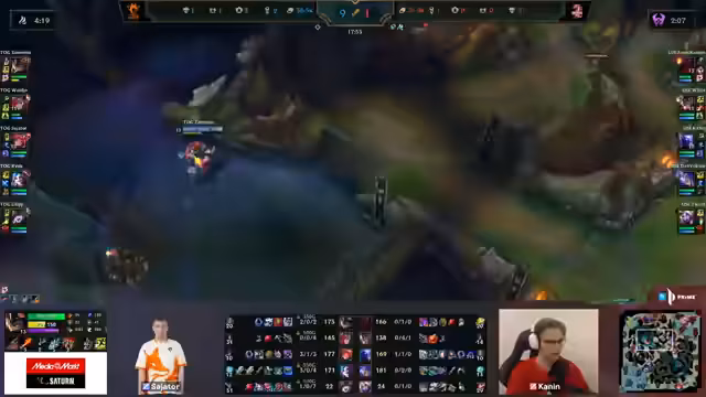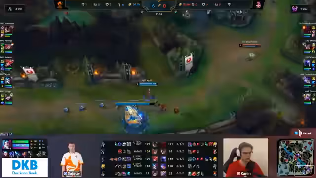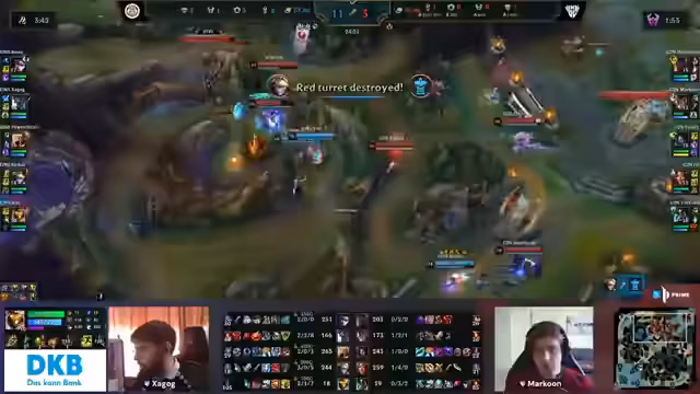00:43:37g2 hat fahrungsprobleme und muss aufpassen, wo sie sich auf der map befinden, da wände, tunnel und pillar sie jederzeit catchen können. makun versucht mit kleinen invades die individuell erarbeitete stärke aufrechtzuerhalten. die sidelines werden zu einem problem, besonders da vane als pick unfassbar viel sideline-arbeit leisten darf. jephi ist im bedrängnis, und in einer minute spawnt der nashor.