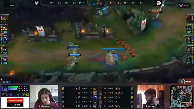 00:48:40g2 hat koordinationsprobleme in den letzten minuten. sie kontesten einen drachen, verloren aber dafür zwei inhibitor-türme und einen inhibitor. in der basis läuft paul vivo mit 3200 hp herum. es wird die verzweiflung von g2 gespürt. toasty geht aggressiv nach vorne, aber jenex kann noch dazukommen. makun fällt, und tokimo kann nur noch den kleinsten helf beitragen.
