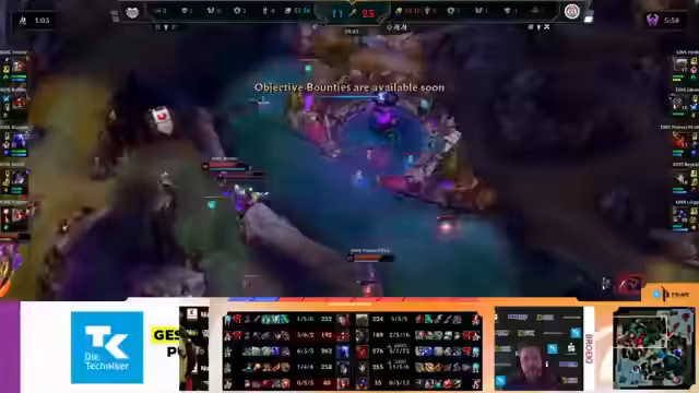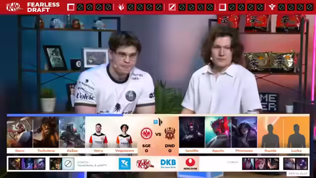 02:57:18Eintracht Frankfurt steht trotz ihres vorhandenen Potenzials punktlos auf dem letzten Tabellenplatz. Spieler wie Vary und Zaka bringen zwar Talent und Erfahrung mit, aber das Team muss noch zusammenfinden. Im Gegensatz dazu steht das Team von Dank Dinos, das überraschenderweise gut funktioniert, obwohl es aus einer Gruppe von Freunden besteht, die ohne großen Organisationshintergrund in der Prime League spielen. Früh im Spiel verliert Phantasm seinen Flash, und Nagurin erzielt den ersten Kill. Kurz darauf gibt es einen weiteren Kill für Agurin, was Eintracht Frankfurt in eine schwierige Lage bringt. Agurin dominiert den Dschungel und baut einen Goldvorteil aus, was es Dank Dinos ermöglicht, die Map zu kontrollieren. Die riskante Komposition von Dank Dinos, die auf Schaden und weniger auf Tanks setzt, scheint aufzugehen, da Agurin in der Lage ist, das Spiel zu beeinflussen. Eintracht Frankfurt hingegen setzt auf ein starkes Late-Game mit Champions wie Viktor und Corki, was jedoch Zeit benötigt.