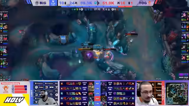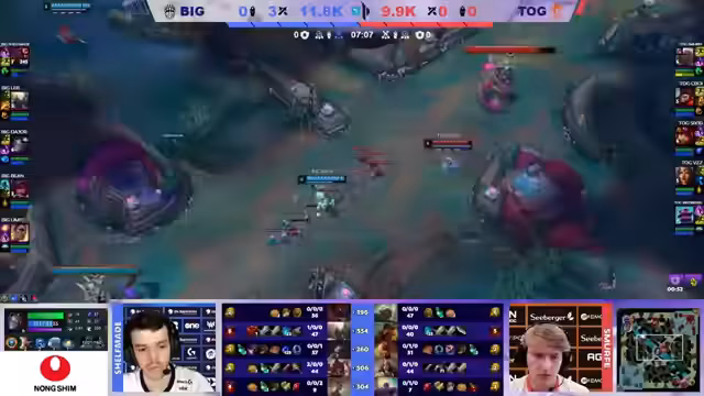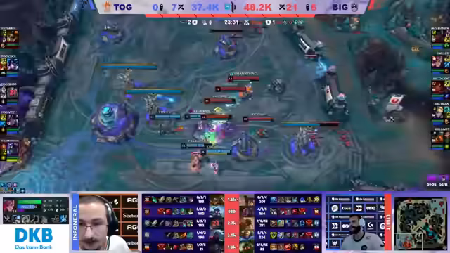 02:36:40Ein kritischer Fight um den ersten Drachen entscheidet das Spiel. Lab verprügelt den Draken, doch T.O.G. antwortet mit einem aggressiven Dive, der Dank Taliyah gecovert wird. Seaboy will den Ezreal spielen, doch das Team fokussiert stattdessen Limit, was den Flash des Spielers zwingt. T.O.G. nutzt erfolgreich den Spellbook auf der Sejuani, um die 2v2s und 3v3s durch Extra-Helps und Cleanse zu verlängern. Nach einem turbulenten Teamfight, der in eine lange Kette an Kills mündet, kann sich BIG den ersten Draken sichern.