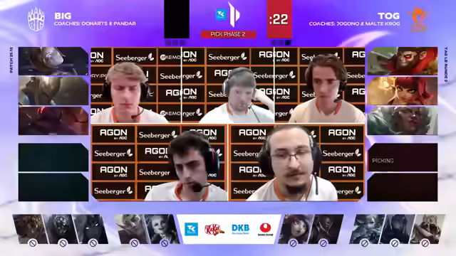 03:10:23Beide Teams beginnen mit dem Draft für das vierte Spiel. T.O.G. setzt auf einen mit Nami und Karma starken Engage, um die Botlane zu dominieren. BIG antwortet mit einem flexiblen Draft, der Karma into Nami als Counter und mit TF als potentiellem Carry im Mid-Game. Die Analysten sind sich uneinig, wer den besseren Draft hat, aber sie sind sich einig, dass T.O.G. einen Überraschungspick benötigt. Es wird eine spannende Serie erwartet, da beide Teams im Draft stark sind.