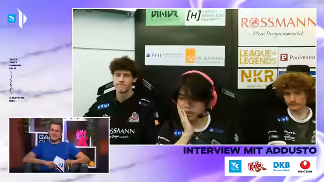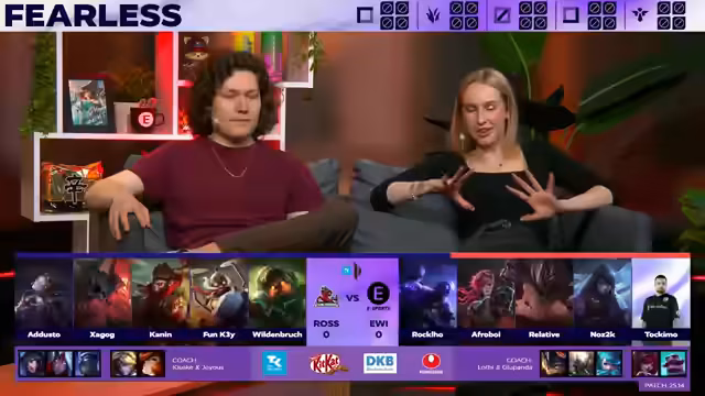 01:30:48Im Anschluss an die erste Partie wird die Leistung von beiden Teams reflektiert. Für Rossmann wird der starke Teamgeist und das schnelle Zusammenspiel nach Spielerwechseln hervorgehoben, während EWI eine tiefe Krise durchlebt. Tokimo von EWI analysiert offen die Probleme seines Teams: Sie seien im Sommer zu passiv geworden und hätten den 'Underdog-Buff' und den Hunger, der sie im Winter stark gemacht hat, verloren. Stattdessen agieren sie vorsichtig, anstatt ihr eigenes Schicksal durch riskante, aber kreative Plays in die Hand zu nehmen.
