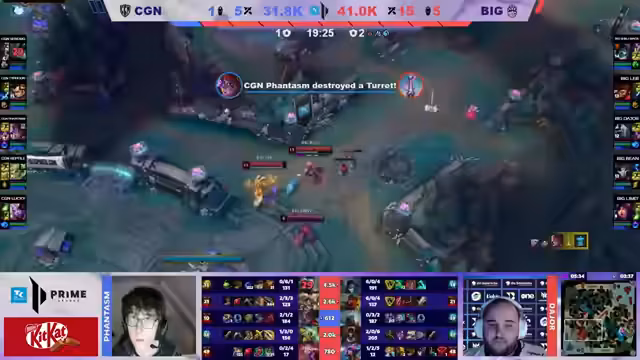 05:12:45Der nächste Drachen spawn und es kommt zum entscheidenden Teamfight. CGN kann den Drachen zwar vorerst sichern, der Fight endet jedoch mit einem Ace für BIG. Der Jungler Lab von Big führt mit einem Quarter-Kill die Tabelle an. Die Golddifferenz ist mit 5000 Gold bereits enorm und das Spiel läuft komplett zu Gunsten von BIG.