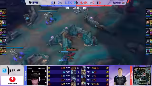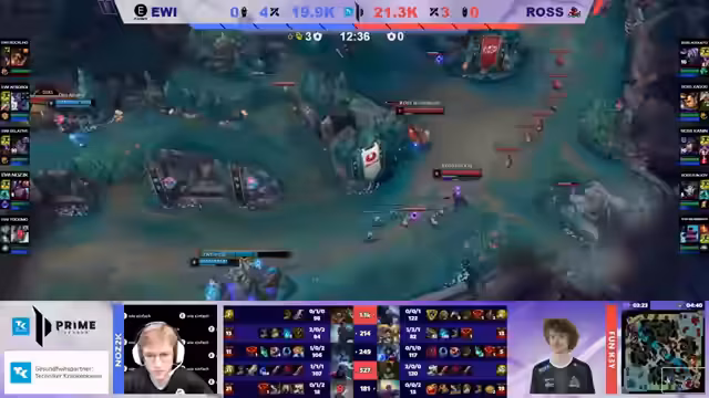 01:12:04Das Spiel beginnt mit einer klaren Dominanz von Rossmann, die in der Laning-Phase alle Vorteile nutzt und so einen massiven Goldvorsprung von fast 5000 Gold nach 17 Minuten aufbaut. EWI versucht, durch strategisches Zonen und Visionsspiele ins Spiel zu kommen, scheitert jedoch an der überlegenen Teamfight-Fähigkeit und dem aggressiven Spielstil von Rossmann. Die Analysten bemängeln bei EWI fehlende Koordination und riskante Plays wie den alleingelassenen Support Wildenbruch, die von Rossmann konsequent bestraft werden. Das Spiel verschlechtert sich für EWI zusehends und erscheint nach 15 Minuten als praktisch entschieden.