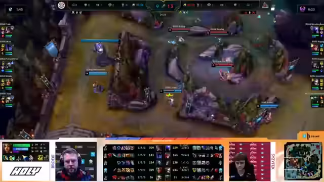 00:59:19Eintracht Spandau baut seinen Goldvorsprung auf 1.100 aus. Rossmann hingegen ist ein Team, das von vorne spielen muss, was ihnen in diesem Spiel schwerfällt. Der Pantheon von Rossmann kann keinen Einfluss nehmen, da er gut getrackt wird. Eintracht Spandau gewinnt die erste Objective, den Drachen. Sie wollen sich sechs Voidcrafts sichern. Nach einem Kampf sichert sich Power of Evil auf Tristana einen Doublekill. Eintracht Spandau führt mit 10 zu 1 Kills nach 9 Minuten. Sie sind bekannt für ihre hohe Kill- und Death-Ausbeute. Eintracht Spandau hat einen Goldvorsprung von 2000 nach 10 Minuten.