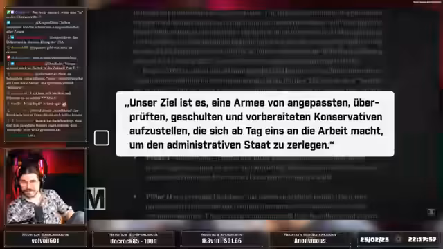 02:09:55Der Stream thematisiert die politische Lage in den USA, wo Präsident Trump in Rekordzeit über 60 Dekrete erlassen hat. Sein Ziel ist es, den administrativen Staat zu zerschlagen, indem er Kontrolleure wie Generalinspektoren feuert und ein neues Ministerium für Regierungseffizienz unter Elon Musk schafft. Laut Historiker Thomas Zimmer handelt es sich um eine Säuberung der Beamtenschaft nach ideologischen Kriterien, um durchzuregieren. Das Ausmaß der Geschwindigkeit und der Rechtsbrüche wird als 'Gleichschaltung' beschrieben. Es werden Bedenken geäußert, dass die USA den Boden für eine autoritäre Ordnung verlieren und andere Länder könnten folgen.