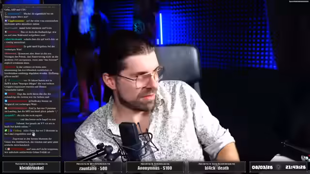 00:12:30Der Stream beginnt mit dynamischer 70er-Jahre-Musik als Einstieg. Der Streamer kündigt eine große Veränderung in seinem Leben an, über die er bereits in seinem letzten YouTube-Video berichtet hat. Gleichzeitig bittet er um Fragen zu einem aktuellen politischen Thema bezüglich Funk, um Transparenz zu schaffen und die Zuschauer, die nicht an politischen Diskussionen interessiert sind, direkt zu informieren. Er klärt auch, warum der Twitch-Kanal weiterhin den Namen Prinz Live trägt, um seine Person stärker von der Marke Parabelritter zu trennen.