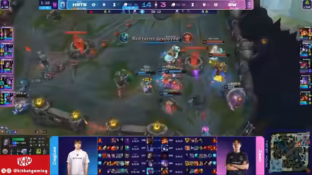 02:47:30Die Unicorns bauen ihren Goldvorsprung weiter aus. Sie gewinnen einen Fight, in dem sie den Feind zurückdrängen, und nutzen die Gelegenheit, um den Mittel-Turm zu zerstören. Die commentators sprechen von einem 'Winning-Fight' und einem 'geilen', strategischen Vorgehen. Trotz eines späteren Tauschs des Turms gegen einen gegnerischen Spieler bleibt der strategische Vorteil bei den Unicorns.
