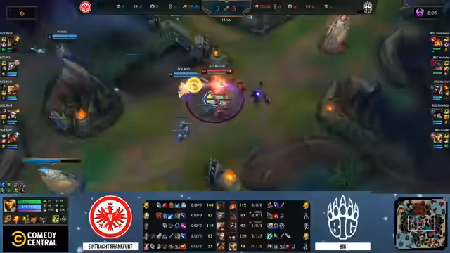 01:11:57Das Spiel beginnt mit einer intensiven early-game Phase. Big führt durch gezielte Aggression in der Botlane, insbesondere gegen den als besten deutschen Supporter bezeichneten Spieler Funky, der bei Big spielt. Frankfurt wird früh unter Druck gesetzt und kann nicht nachhaltig gegen die überlegene Botlane von Big kontern. Der Analyst hebt die starke Performance von Big hervor, besonders von Kaiser und Funky, die das Spiel dominierten und Frankfurt zur Aufgabe zwangen.