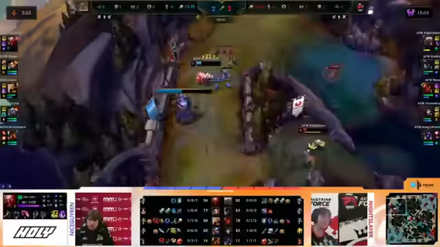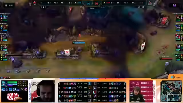 01:03:38Im mittleren Spielphase kontrollierte AFW weiterhin das Geschehen. Danker und Hungry Panda dominierten die Bot-Seite und Night Slayer auf Gwen pushte erfolgreich die Top-Lane. Rossmann versuchte mit einer Sejuani- und Pyke-Kombo zwischen den Lanes zu agieren, fand aber keine klaren Ansätze. Die Map wurde weiter von AFW kontrolliert, was zu ständigen Skirmishes führte. Sisyphek auf Varus blieb ärmster Spieler des Spiels, während sich die Goldlücke vergrößerte.