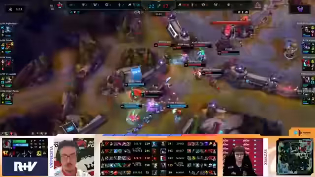 01:22:55Im entscheidenden Moment entscheidet sich AFW für einen Baron-Nashor, während Rossmann gleichzeitig den Drake sichert. Dieser Schachzug zahlt sich aus, da AFW die Soul erhält. Nach hartem Kampf um den Nashor verlieren Rossmanns Carries ihr Leben, während AFW den Baron erfolgreich stiehlt. Kommentatoren sprechen von einem 'Tanz auf Messers Schneide' und bewundern das Comeback von AFW, das ihnen das entscheidende Momentum verschafft. Das Spiel ist nach diesem Zug für AFW im Grunde entschieden.