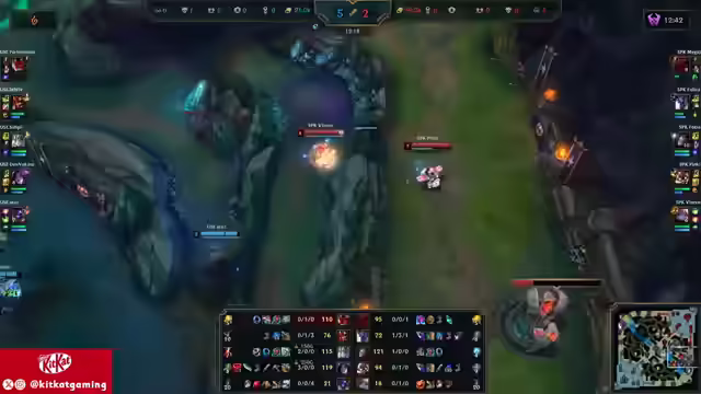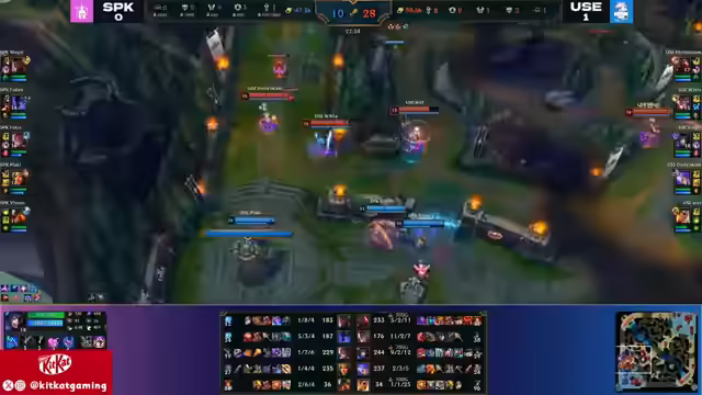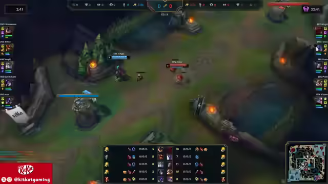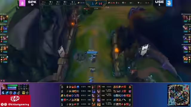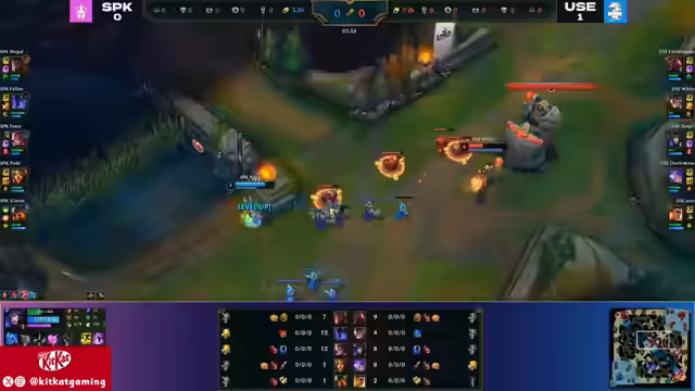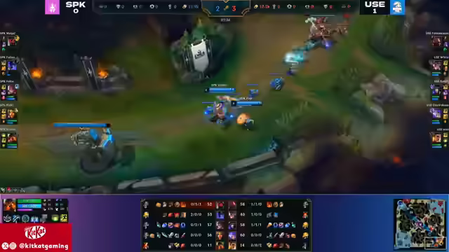 01:40:44Die Unicorns sichern sich First Blood, was jedoch keinen Bonus-Gold mehr bringt. White wird im Jungle erwischt, bleibt aber aggressiv. Bait verschwendet Zeit mit einem abgebrochenen Backport. Simpli erhält einen Kill durch einen Gank des Supporters, wodurch Foxy ins Hintertreffen gerät. Auf der Top-Lane kommt es zu einem Duell zwischen Sion und Cassante, bei dem Megal einen leichten Vorteil hat. Nocturne versucht einen Gank auf der Top-Lane, wird aber von For No Reason ausgekontert. Die Unicorns starten einen Drake und sichern ihn sich. Simply dominiert die Midlane und setzt Foxy unter Druck. Es wird diskutiert, ob die Rod-Ari von Simply effektiv ist, da sie wenig Schaden verursacht, aber viele Setup-Möglichkeiten bietet. Ein perfekter Antwort-Play der Unicorns führt zu einem Double Kill für White und einem missglückten Dive von Spike.