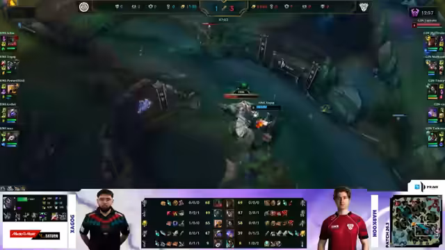 03:12:59Das Spiel beginnt mit einer aggressiven Phase von G2 Nord. Rind, der AD Carry von G2, ist ohne seine Ultimate und setzt darauf, dass sein Teamkamerad Makuno die nötige Vorarbeit leistet. Eintracht Spandau nutzt einen Laneswap, um den Botlane-Tower zu sichern und das Gold auszugleichen, während G2 Nord den ersten kleinen Lead etabliert. Die Teams erkunden das aktive Map-Control, und Spandau sucht gezielt nach dem ersten Drachen, während G2 Druck auf der Top-Seite aufbaut.