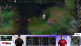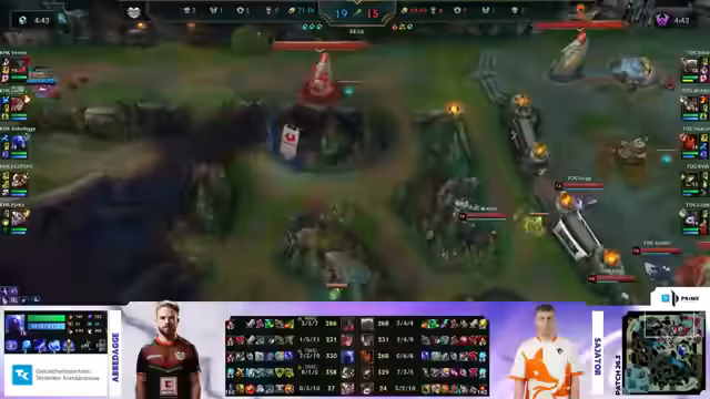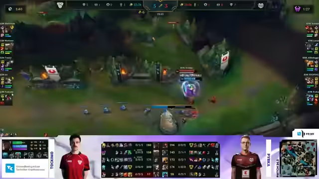02:02:00Mit dem Spawn des Baron Nashors verschärft sich die Lage für Kaufland. Ihr Toplaner Venur hat keinen Teleport mehr und kann nicht zur Unterstützung in einem erwarteten Teamfight eilen. Kaufland ist gezwungen, einen Front-to-Back-Fight zu spielen, den die Analysten als sehr riskant und wahrscheinlich verlierbar einstufen. Trotzdem gelingt Kaufland ein Überraschungserfolg, als sie den Kog'Maw von Team Orange Gaming eliminieren können. Sie stürmen daraufhin den Baron und fegen mit einem beeindruckenden Teamfight und einem Triple Kill von Exofang drei der fünf Gegner vom Feld, was das Spiel wieder offen gestaltet.