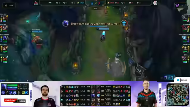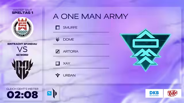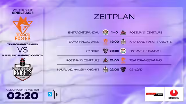00:43:11Das Eröffnungsspiel zwischen Eintracht Spandau und Rossmann beginnt mit einem favorisierten Start für Spandau. Der Top-Laner CPM von Rossmann kann jedoch früh einen Solo-Kill gegen GenX von Spandau landen und sich ein erstes Gold sichern. Im weiteren Spielverlauf kämpfen beide Teams um Drakes und Objektive. Ein Highlight ist der erfolgreiche Drake-Stahl von Spandaus Ryze-Spieler Funesis, der jedoch durch einen fatalen Übergriff unter den Turm stirbt. Das Spiel eskaliert, und Spandau beginnt, den Vorteil auszunutzen. Nach einem Teamfight bei dem Herald steht es 2 zu 0 für Spandau, das nun eine klare Dominanz zeigt und den Sieg einfährt.