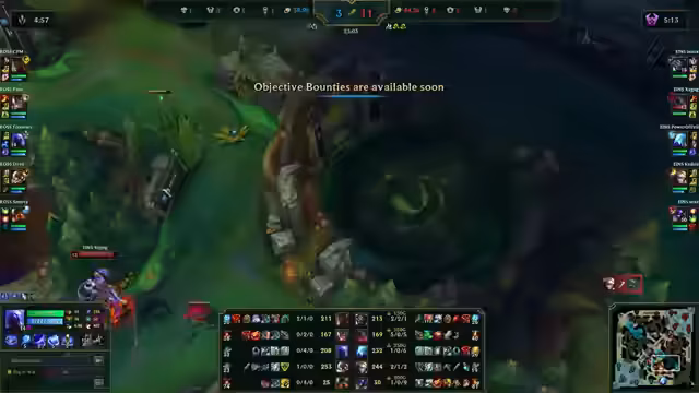 04:15:52Der Goldunterschied wird nun massiv, mit einer Fehlleistung von über 7.000 Gold für Rossmann. Jede einzelne Lane verliert, und TOG kann durch kluge Plays, wie die Nutzung von Poppy's Ultimativer Fähigkeit, Teamfights zu ihren Gunsten entscheiden. Rossmanns einzige Chance, das Spiel zurückzuholen, bestünde im Erzielen von Shutdowns, doch die fehlenden Mobilitätstools und die starke Rotation von TOG machen dies unmöglich. Das Spiel gilt als entschieden.