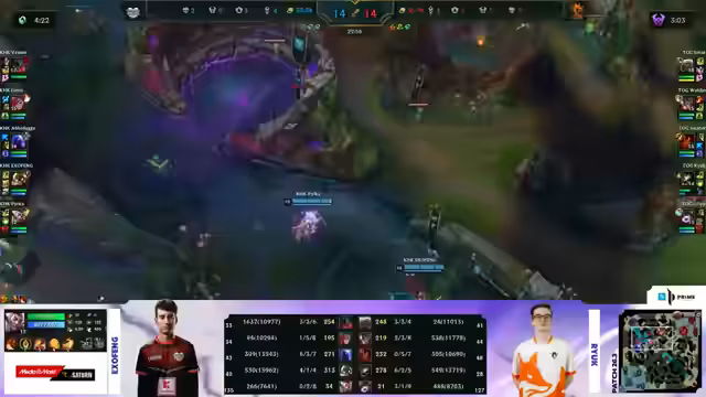 02:11:29Das Spiel erreicht das späte Stadium und dreht sich fast vollständig um die beiden AD-Carries. Exofang von Kaufland und Ryuk von Team Orange Gaming sind die dominanten Akteure. Während Ryuk auf einem Full-AP-Kog'Maw mit hohem Schaden und Heilungsfähigkeiten glänzt, kämpft Exofang auf seinem Corki gegen die aufdringliche Lulu der Gegner. Der Analysten-Kommentar beschreibt den Kampf als ein Duell zwischen Ryuks "Tankiness" und Exofangs Schadensoutput, bei dem das Team um die beiden Träger herum fightet. Die Teams spawnen Baron und Elder, um das entscheidende Ziel zu sichern.