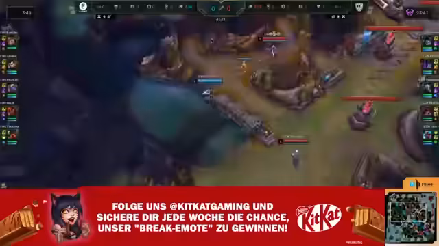 02:41:55Die Unicorns drehen das Spiel, indem sie auf der Botlane einen starken Trade machen, mehrere Platten nehmen und so den Goldvorteil wachsen lassen. Nach dem First Blood auf Duncan durch Simply verliert auch Hangry Panda einen Kill, und das Spiel kippt endgültig. Die Kills von Seas auf Tristana und der Solo-Kill von Dant Voxer gleichen das Gold wieder aus, doch die Unicorns haben das Momentum übernommen und agieren nun dominierend.