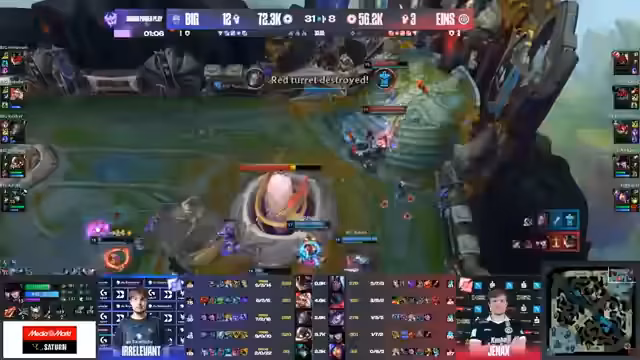 01:57:44G2 Nord zeigt überlegene strategische Spielweise mit synchronem Wave Push und nutzt ihre Goldvorteile effizient. Mit 12.000 Gold mehr, vier Drakes, der Soul und besseren Items kontrollieren sie das Spiel vollkommen. Die individuellen Leads auf Makun (fast 6k) und Rin (knapp 4k) werden sichtbar und spielen eine entscheidende Rolle beim Sieg.