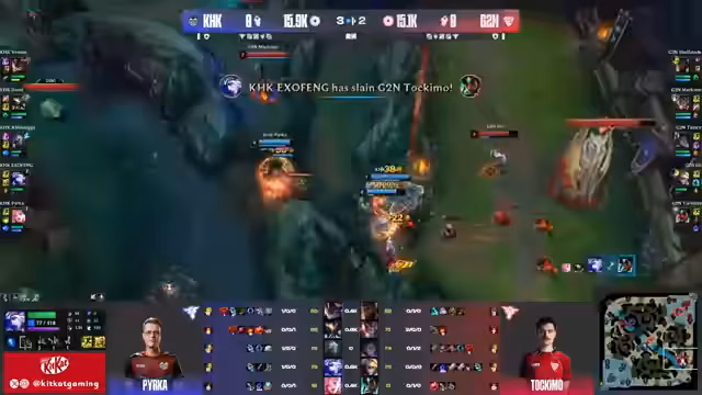 01:45:12Im Mid Game holen sich G2 Nord den Hextech Drake, was ihre Position deutlich verbessert. Der Jungle-Pressing von G2 wird stärker, während Kaufland Schwierigkeiten hat, koordiniert zu agieren. Densi von Kaufland macht einen Fehler, der zu einem Teamfight-Killer wird. G2 nutzt diese Situation aus, weitere Kills zu holen und ihren Goldvorsprung zu vergrößern. Xerxa als Skana zeigt dabei eine ausgezeichnete Performance.