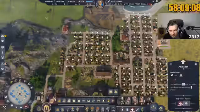 02:45:36Der Streamer optimiert die Wirtschaftseinheiten konsequent auf Platz- und Ressourceneffizienz und verzichtet daher komplett auf Seifenproduktion. Stattdessen konzentriert er sich auf Produkte wie Brot, Bier und Käse, die mehr Einwohner pro Fläche bringen. Die Herausforderungen durch Piraten und die unzureichende Störversorgung werden als zukünftige Probleme identifiziert, während er aktuell versucht, globale Produktionsketten aufzubauen.