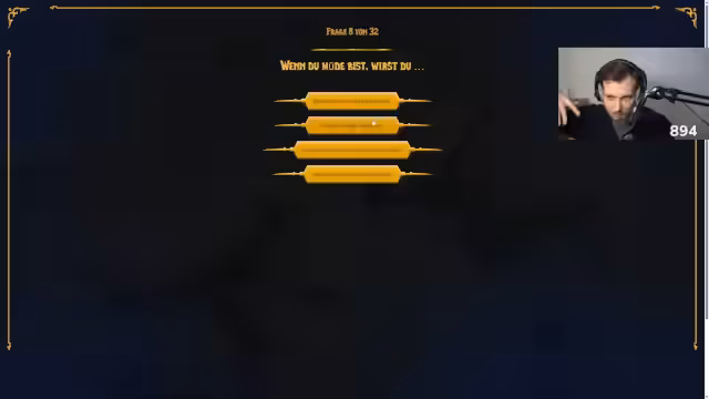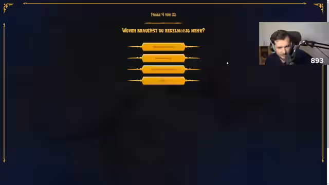 00:37:22Ein Rhythmus-Fragebogen zeigt seine Vorliebe für 1-2-1-2-Muster, erinnert an Atemübungen. Bei Gedankenformen beschreibt er sein chaotisches Denken als nicht linear, aber funktional. Für WoW-Customization wählt er klar das optisch beste Aussehen mit den besten Stats statt Realismus. Als Repräsentant would jemanden nehmen, der Ruhe reinbringt, nicht jemanden, der konfrontativ ist. Für den Streamstart braucht er Kaffee und Stille – direkte Produktivität am Morgen ist sein Erzfeind.