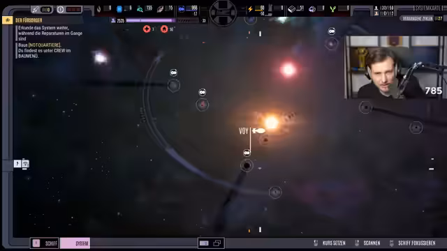00:41:49Nach der Notlandung stellt der Streamer fest, dass die Voyager stark beschädigt ist und die Crew knapp ist. Er beginnt, das Schiff zu managen, indem er Ressourcen wie Deuterium sammelt und die wichtigen Systeme repariert. Da die Crew-Mitglieder eine endliche Ressource sind, muss er sorgfältig mit ihnen umgehen. Der Streamer erfährt, dass die Crew, insbesondere die unteren Ränge, schnell stirbt, wenn sie an bestimmten Orten gesichtet werden. Er repariert zunächst die Torpedos und den Warpkern, um das Schiff betriebsfähig zu machen.