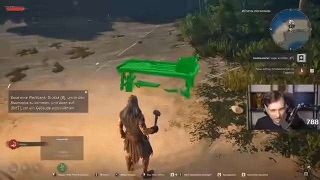 02:44:02Nachdem der Streamer die Bedrohung durch Dodos und Wildschweine erkannt hat, beginnt er, sich besser auf die Situation vorzubereiten. Er stellt Taschen aus Grobem Stoff und Seil her, um seinen Inventarplatz zu erweitern. Nachdem er die grundlegenden Werkzeuge wie einen Sägebock und eine Werkbank gebaut hat, beginnt er mit dem Bau einer ersten Basis. Er errichtet eine Hütte und stellt wichtige Möbel wie einen Tisch und eine Schüssel her, um seine Überlebensfähigkeit zu erhöhen und einen sicheren Ort zu schaffen.