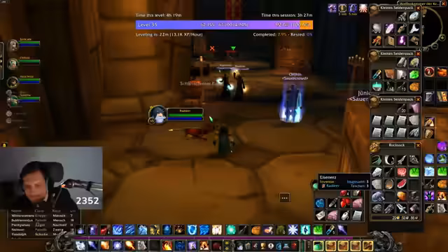 07:40:37Der Streamer erläutert die Erfahrungspunkte aus einer Questline und belohnt die Armschiene, die für einen 'Castra' nützlich ist. Er erwähnt, dass die Seidenbänder 50% besser sind und erhält ein 'Licht segne' mit 3500 Gold. Anschließend diskutiert er die Notwendigkeit, nach Rühestein zurückzukehren. Später spricht er über die Quest XP, die er noch einsammeln kann, und erwähnt, dass er keine Rested XP hat, was seine Frustration über das langsame Questing mit einer bestimmten Klasse ('Parla') deutlich macht. Dies wird durch lange Questdauern und schlechte Laune im Stream unterstrichen, wobei er auch über die Notwendigkeit eines zweiten Strangs für besseres Heilen reflektiert.