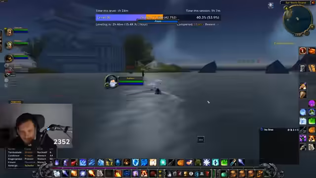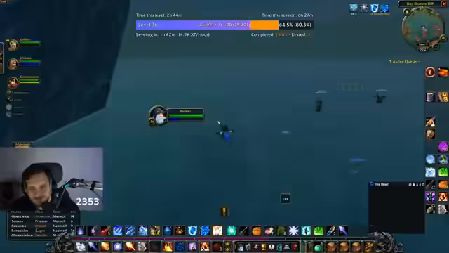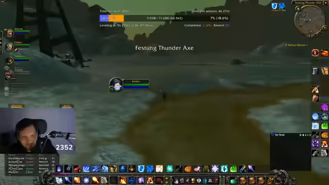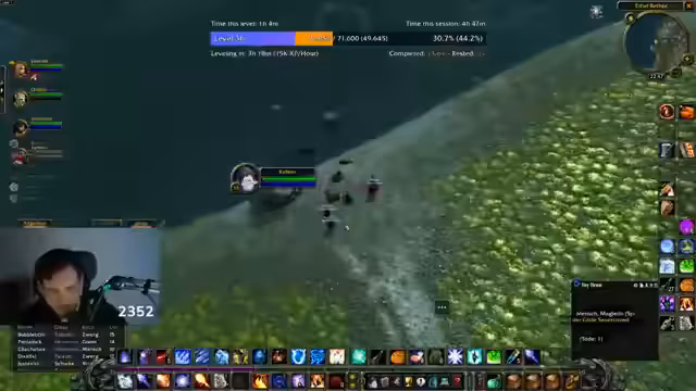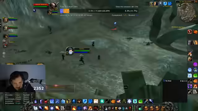08:36:43Am Ende des Streams versucht die Gruppe, die Murloc-Flossen-Quest abzuschließen. Sie kämpfen gegen Elite-Murlocs, bei denen der Streamer Schwierigkeiten hat, Aggro zu halten, und er bemerkt, dass die Gegner Fähigkeiten haben, die seine HP auf 15% reduzieren. Er erwähnt, dass er bereits mehr Todesfälle als in Flensburg gesammelt hat, aber insgesamt nur wenige Tode im Event. Die Quest gestaltet sich als nervig und gefährlich, besonders weil Fatigue unter Wasser auftritt. Der Streamer versucht, mit Heilungen und Pull-Strategien umzugehen, aber die Zeit wird knapp.