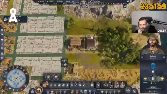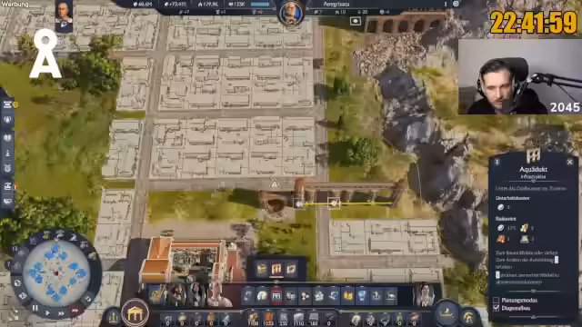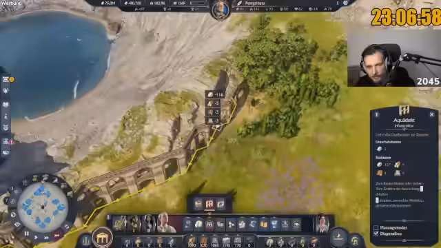 06:39:42Der Streamer gibt Ratschläge zum Layout von Städten in Anno 117, insbesondere wie große Gebäude gewinnbringend platziert werden können, um möglichst viele andere Gebäude abzudecken. Er erwähnt, dass er am Ende des Videos detaillierter auf das Layout eingehen wird. Ein Zuschauer fragt, ob das Ziel von einer Million Einwohnern erreicht werden kann, woraufhin der Streamer antwortet, dass dies in den nächsten 100 Stunden herausgefunden wird und es nicht einfach sein wird. Es wird auch die Frage nach der Forschung von Feldbewässerung und Plantagenforschung (Aqua Arborica) beantwortet, die notwendig ist, damit Zisternen alle Farmen und Plantagen bewässern können. Die Herausforderung, die Versorgung für die wachsende Bevölkerung sicherzustellen, wird mehrfach betont, insbesondere im Hinblick auf Olivenöl und Amphoren.
