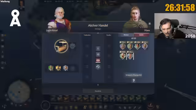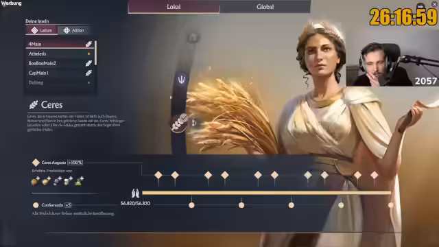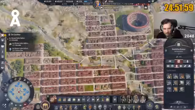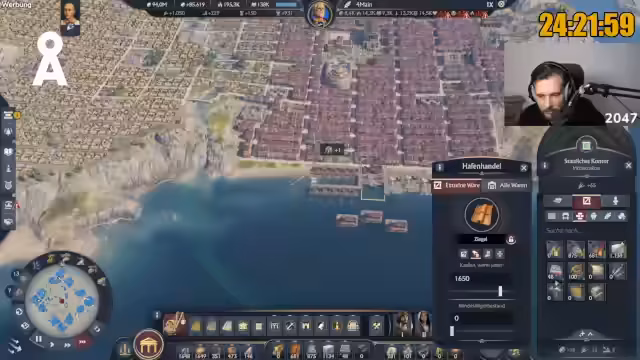 05:24:25Der Streamer erwähnt, dass er aufgrund von Platzmangel in seiner "Einzimmerwohnung" im Spiel noch kein Kolosseum gebaut hat, obwohl er bereits 230.000 Einwohner erreicht hat. Er scherzt über die Schwierigkeit, ein so großes Prachtgebäude zu integrieren. Ein Item, das anfangs vielversprechend schien, der "Prachtbauten in Reichweite generieren plus 4 Ansehen", sei hauptsächlich für das Ansehen-Farmen wichtig, um mit einem Kolosseum einen hohen Ansehenswert zu erzielen. Er stellt fest, dass das Item-System in Anno 117 im Vergleich zu Anno 1800 noch "mau" ist und ein Item-Viewer fehlt, um sich einen Überblick über verfügbare Items und deren Fundorte zu verschaffen. Die Community sei hier eine wichtige Informationsquelle. Die geringe Anzahl legendärer Items und die Schwierigkeit, bestimmte Güter wie Kaviar in ausreichender Menge zu produzieren oder einzukaufen, werden als große Herausforderungen für das Erreichen des Eine-Million-Einwohner-Ziels genannt.