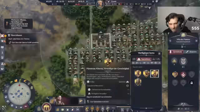 06:35:48Der Streamer erreicht den Rang des Konsuls und erhält dafür 50.000 Ruhm. Eine zentrale Mission im späteren Spielverlauf ist die Unterwerfung von Herrschern wie Dodjan, um als Vasall einen mächtigen Spezialisten an den eigenen Hof zu holen. Vasallen behalten ihre Inseln und deren Effekte, schließen sich aber dem Verbündeten an, was strategisch genutzt werden kann, um sich mit starken Einheiten zu verstärken.