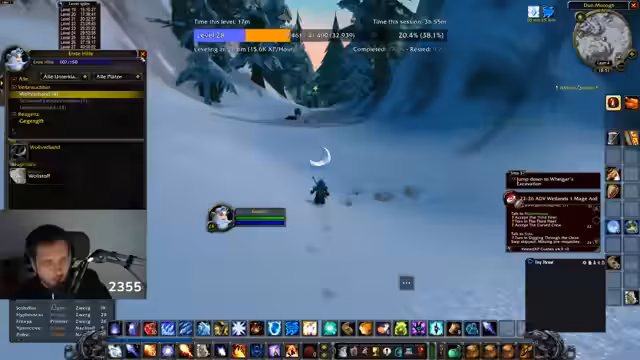 05:36:26Die Gruppe wendet sich Quests zu, darunter das Sammeln von Äpfeln für eine Umwandlungsquest und der Auftrag eines vermissten Diplomaten. Sie besucht verschiedene NPCs in Stormwind, interagiert mit Automaten und diskutiert die Länge und den Nutzen der Quests. Ein Spieler stellt fest, dass einige Quests, wie die der 'Vermissten Diplomaten', sehr lang und nicht immer lohnenswert sind, während andere schnellere XP bieten. Die Gruppe erwähnt auch, dass sie für weitere Hilfe einen zweiten Spieler benötigt, um bestimmte Elite-Quests zu bewältigen, und diskutiert die Möglichkeit, sich in Gruppen aufzuteilen.