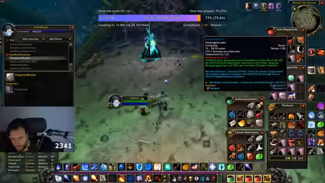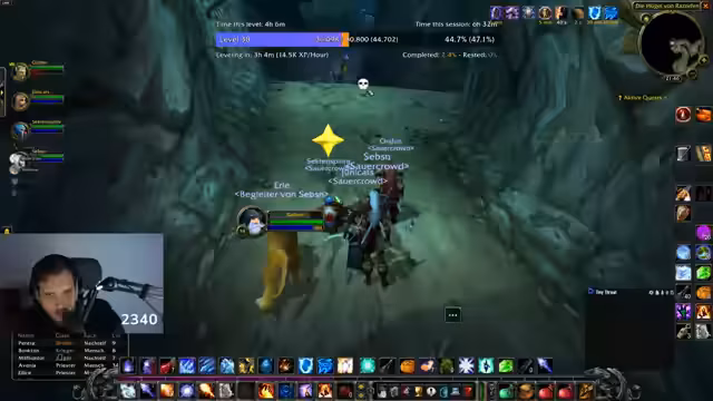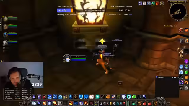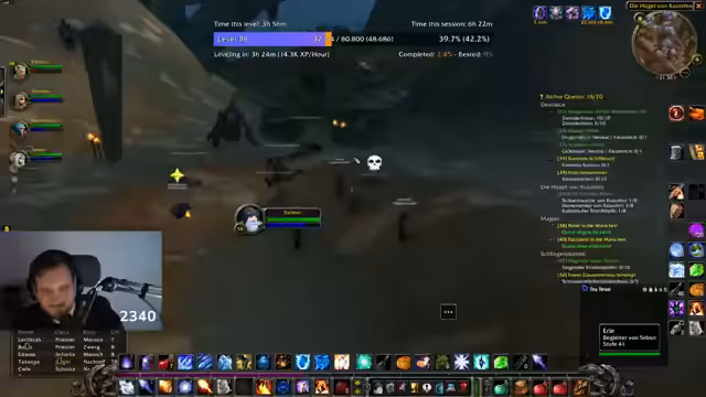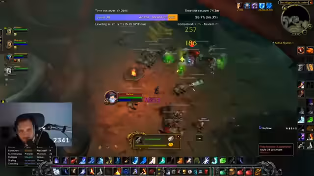 02:21:06Die Gruppe diskutiert die Abgabe von Quests und den Ruhestein, wobei der Streamer sein Gold für ein Reittier sparen möchte. Diskussionen über AoE-Farming bis Level 40 und Portal-Zugang von Mägden entstehen, ehe er sich mit der frustrierenden Magier-Klassenquest befasst. Diese schickt ihn in unübersichtliche Gebiete, erfordert Seltenheitssammlungen und bietet geringe XP, wobei die Suche nach Gegenständen wie der Hellkugel und dem Blitzdornenbusch lange dauert. Das Experiment mit AoE-Grinding bei Murlocs wird als riskant beschrieben, bis er sich gegen weitere Grinding-Versuche entscheidet.