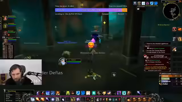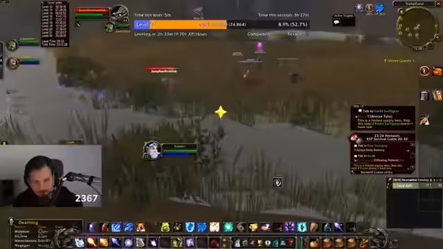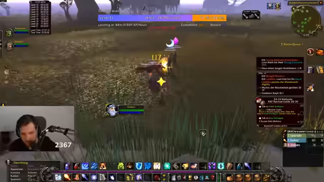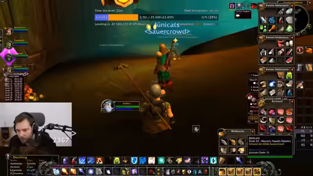 02:34:30Nach den Störungen wird die Fertigstellung der aktiven Quests priorisiert. Die Gruppe konzentriert sich auf das Absolvieren der Krokodil- und Murloc-Jagd. Dabei stellt sich die Gruppendynamik als sehr effektiv heraus, da man Mobs schnell und effizient bündeln kann. Die Laune des Streamers hebt sich deutlich, als die Quests zügig abgeschlossen werden. Dies führt zu einer lockeren Stimmung, in der der Streamer Kommentare über Pausen, Fast Food und wieder über Griefer einstreut.